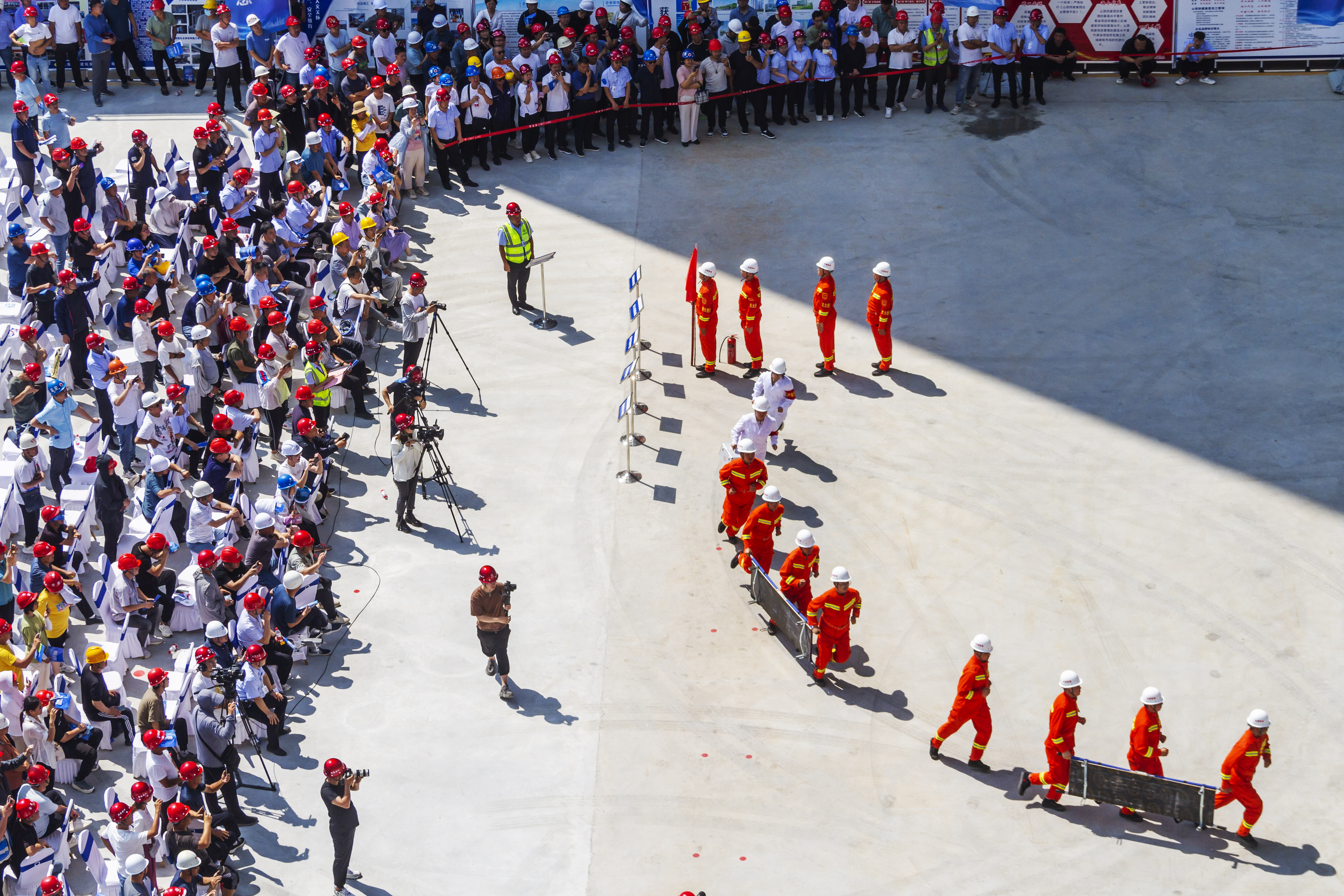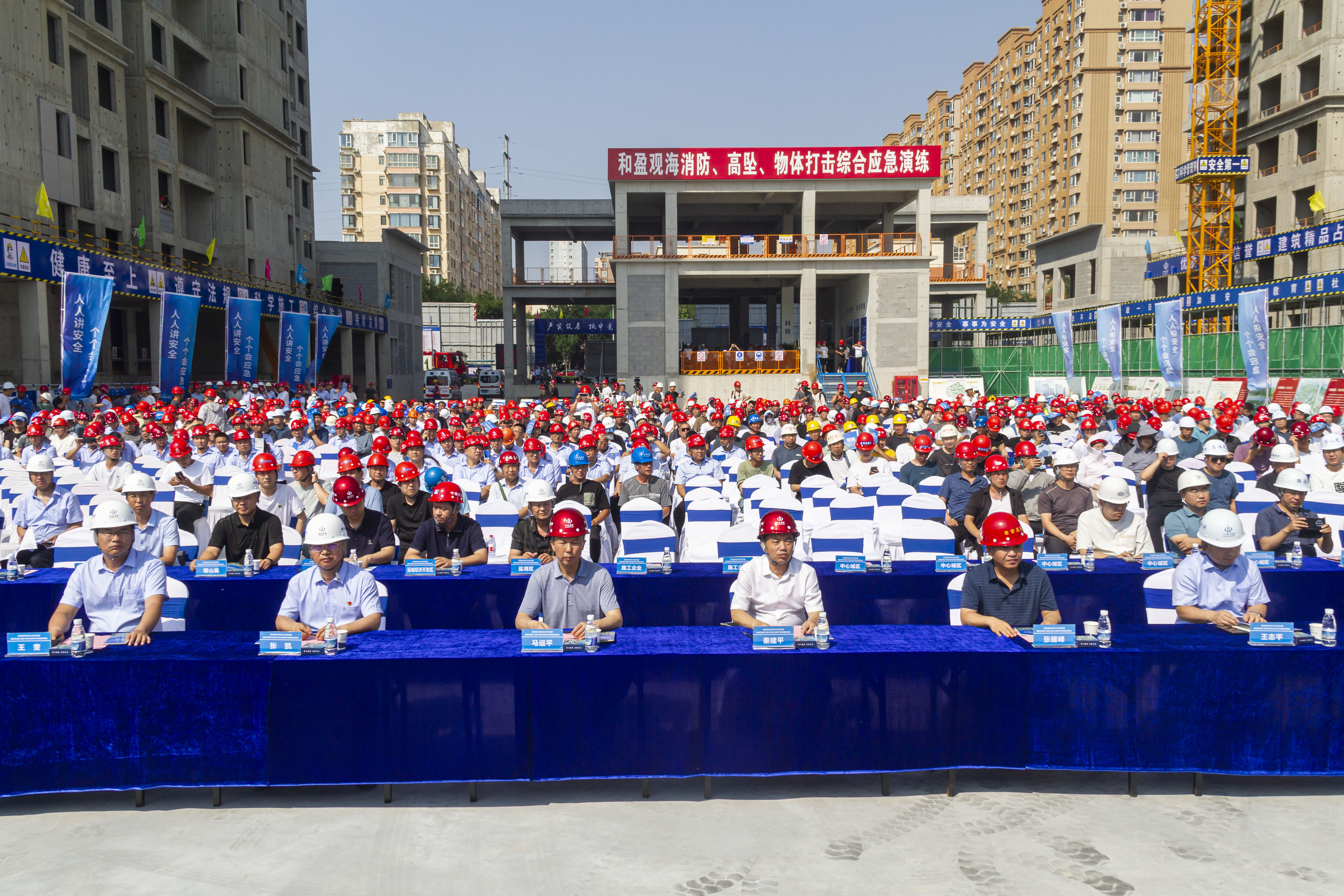 观摩结束后,和盈观海项目进行了消防、高空坠落、物体打击综合应急演练,对预案的可行性进行了检验,整个演练过程救援及时、处置得当,应急预案科学合理。