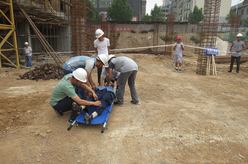 当日上午10时,柴贵杰副总宣布演练正式开始。在项目部施工现场,工地一名搭设脚手架的工人,因天气炎热中暑,从外脚手架滑落,情况十分危急,现场工人班组向项目部电话报告,在接到报告后,治安维护组人员及时赶赴现场拉好警戒线,疏散引导现场人员,禁止其他人员靠近事故现场,保证救援通道通畅。抢救组人员对现场伤员采取临时急救措施后,将伤员抬上应急救援车送往就近医院进行救治。上午10:30分,在项目部钢筋加工区处,一名电焊工在操作机械时触电昏厥,现场一名工人发现后立即发出呼救信号,同时切断了电源,项目部在得到消息后,指挥长郭思佳立即启动触电应急救援预案,第一时间联系治安维护组及抢救行动组,抢救小组人员迅速赶赴现场检查汇报伤员病情,在进行了紧急抢救后,随后将伤者用担架抬上应急救援车送至附近医院进行救治,确保伤员及时得到治疗,赢得了宝贵时间,此次应急演练圆满成功。