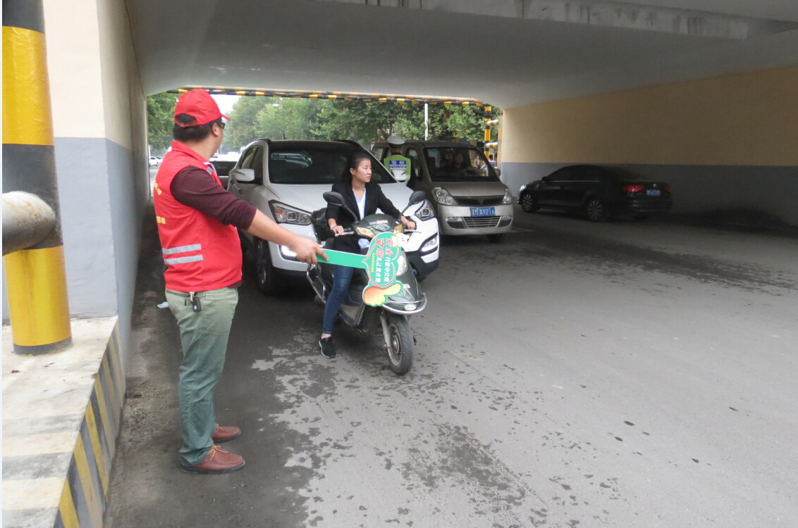 所有参加活动的志愿者身穿志愿服、佩戴党徽、手拿引导牌,用文明耐心的语言劝导、纠正行人乱闯红灯、乱穿乱行、不走斑马线、翻越护栏、非机动车违规行驶等交通不文明行为,给问路的群众提供帮助,引导行人遵守交通规则,增强市民的文明交通意识。