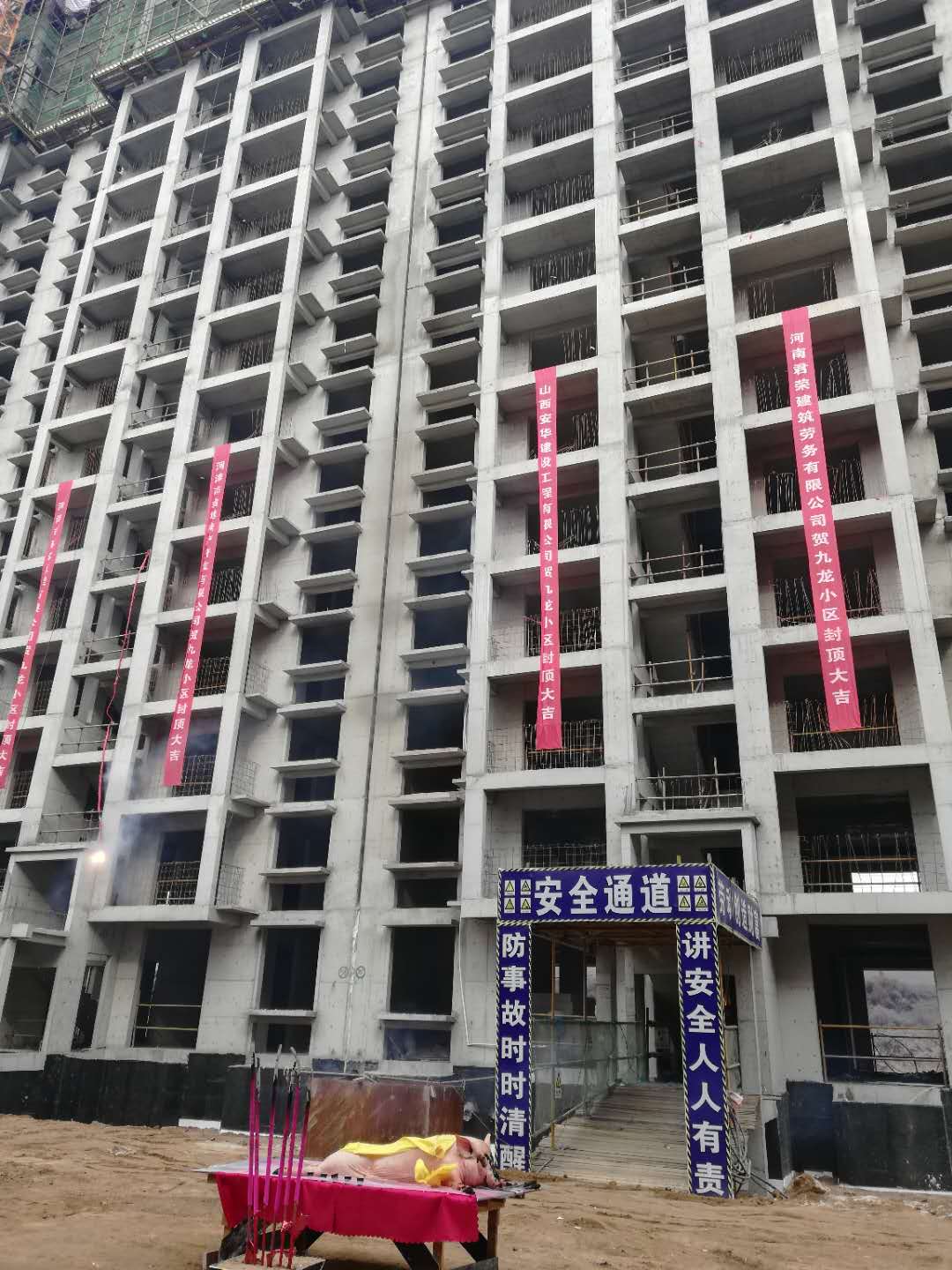 截止目前,九龙小区两栋17层、七栋7层共九栋楼全部封顶。九龙小区从一片空地到楼宇林立,项目部全体人员不忘初心,本着“精雕细琢,追求卓越”的管理方针,严格按照设计及规范要求施工,切实保证施工进度按时完成,给甲方和公司交上了一份满意的答卷。目前该小区1#3#5#6#9#楼准备主体验收,2#4#7#楼正在安装单元楼住户电梯,明年将全面进行交工。             (杨国娜)