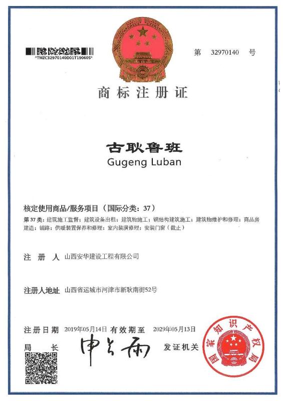 “古耿鲁班”商标的注册,是公司增强品牌意识,大力推进商标战略的一项重要举措。注册商标作为企业的无形资产,对抢占市场,拓展业务,形成自有品牌形象,保护品牌价值不受盗取具有十分重要的作用。