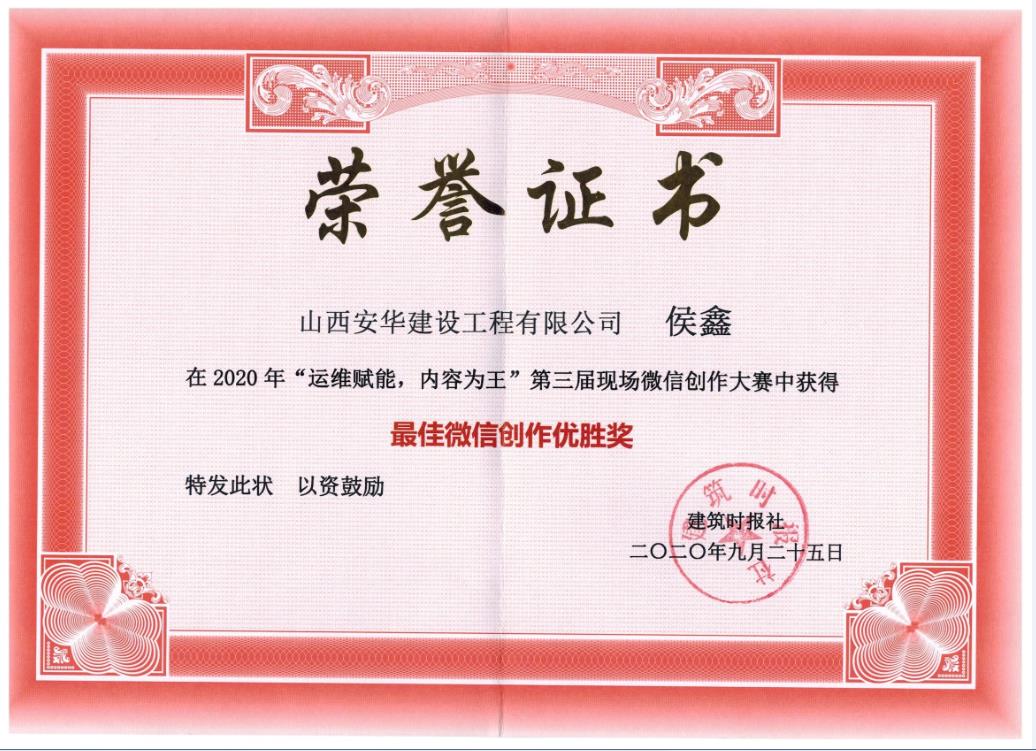 大会共同探讨了新媒体内容生产和推广运营的经验,山西安华微信公众号从全国参评的500多家建筑企业微信公众号中脱颖而出,喜获2020年全国建筑业优秀微信公众号。在微信创作大赛环节,70余家创作团队同场竞技,围绕“华建上院项目”主题,选择工程施工特点、安全文明、人物专访等内容,通过现场采写、取材、拍摄,制作微信内容。经过会场展示、专家打分,我单位创作团队荣获“最佳微信创作优胜奖”。