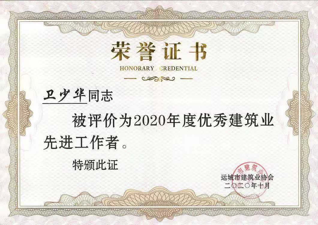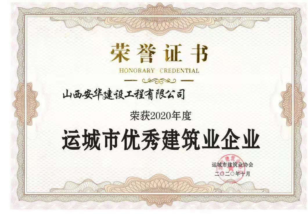 2020年,公司以突出的贡献、良好的发展态势、持续的创新能力和优秀的企业文化,被运城市建筑业协会评为“2020年度运城市优秀建筑企业”。总经理卫少华重视队伍建设,通过逐步完善的运行机制,带领公司快速发展,继而获“2020年度运城市建筑业先进工作者”称号。公司李克信、王效芳、乔利和师慷宁四名同志更是获得“2020年运城市建筑业优秀项目经理”称号。这些荣誉的获得,不仅是对公司的肯定,更是对全体员工的鞭策和激励,使全体安华人更加坚定了以习近平中国特色社会主义思想为指导,以转型升级为主线,团结一心,奋力拼搏书写安华发展史的信念和决心。