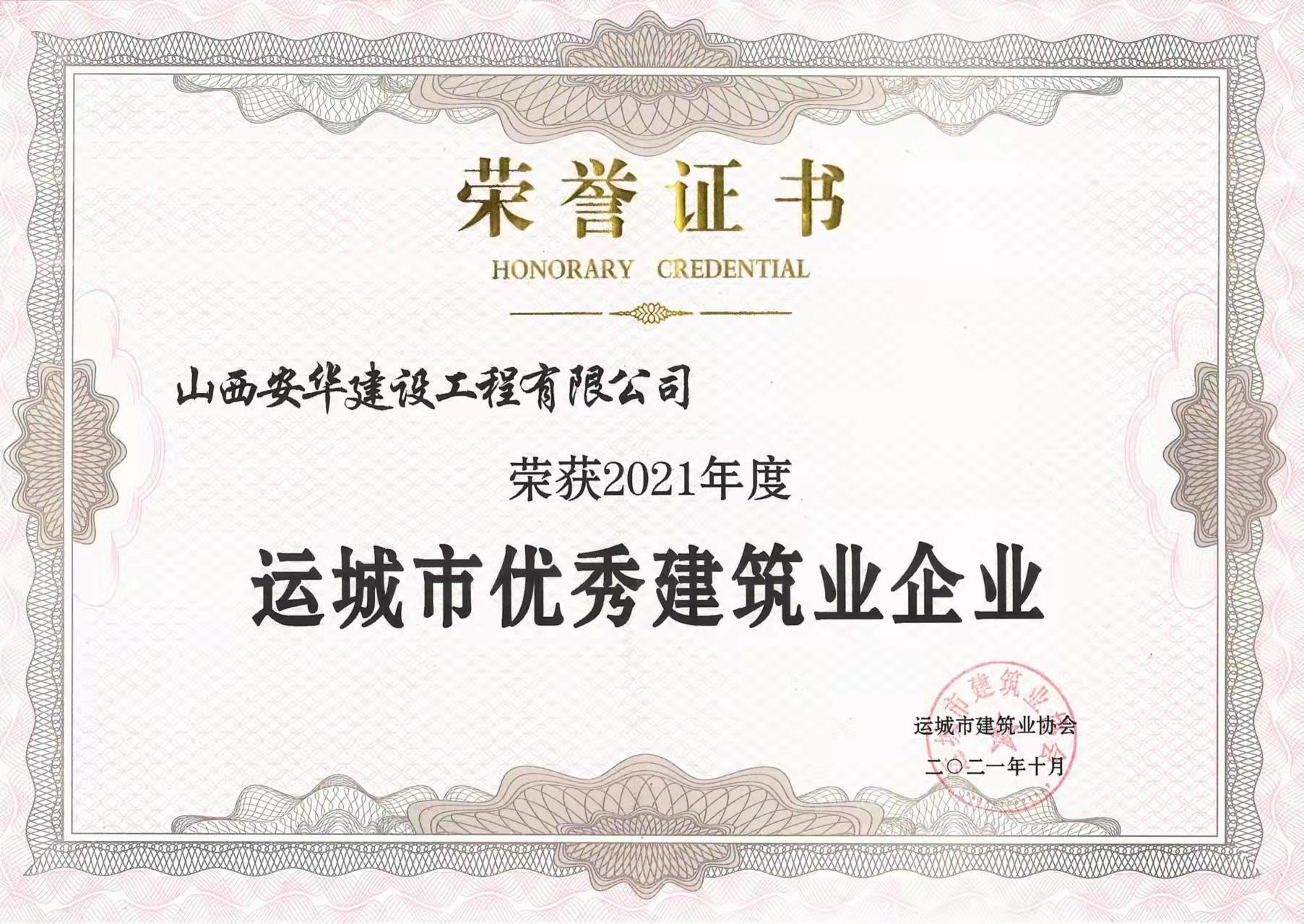 经过全体安华人的不懈努力,近日,公司荣获“2021年度运城市优秀建筑业企业”的殊荣。此外,原成民、李春荣、樊晓军、李达、胡帅、黄宁宁六名同志被评为“2021年度建筑业优秀项目经理”。